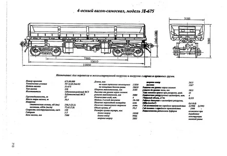 Думпкар 31-675 четырехосный вагон-самосвал грузоподъёмностью 67 тонн предназначен для перевозки и выгрузки сыпучих и кусковых грузов насыпной плотностью 1,7-2,0 т\м3 как на путях промышленных предприятий, так и на путях МПС, оборудован переходной площадкой. Конструкция вагона-самосвала обеспечивает необходимую прочность при погрузке в кузов сыпучих и мелкокусковых грузов экскаваторами с ковшом вместимостью до 6 м3, а также отдельных кусков массой до 2т с высоты не более 2-х метров с предварительной подсыпкой на пол кузова мелкой породы толщиной не менее 300 мм.